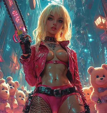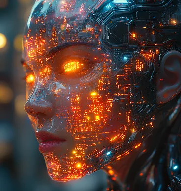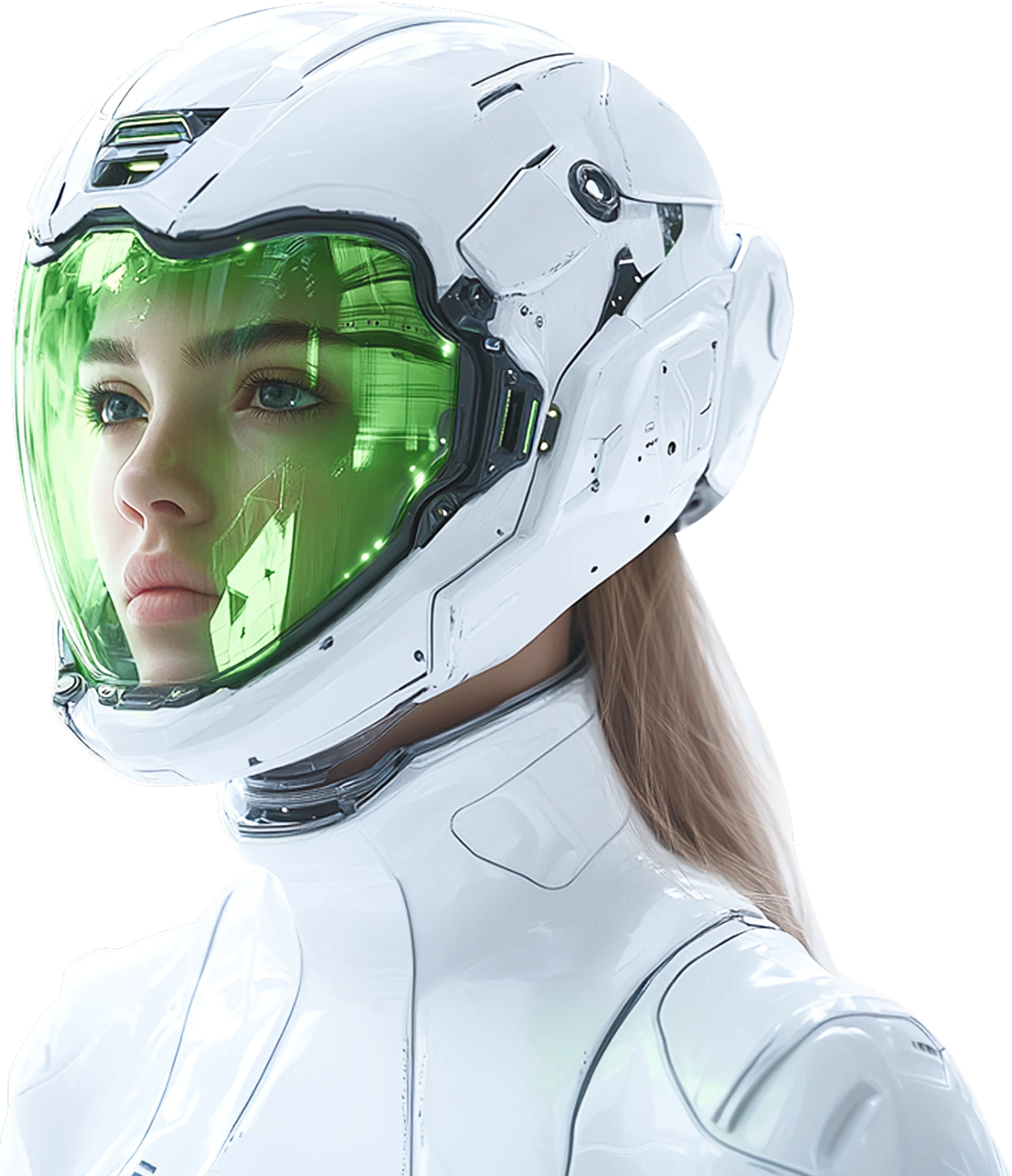 A girl looking to the left with a futuristic cyberpunk style, bright colors, set against an orange...