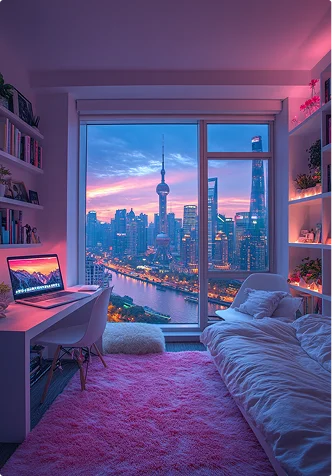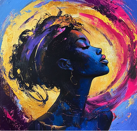 A girl looking to the left with a futuristic cyberpunk style, bright colors, set against an orange...